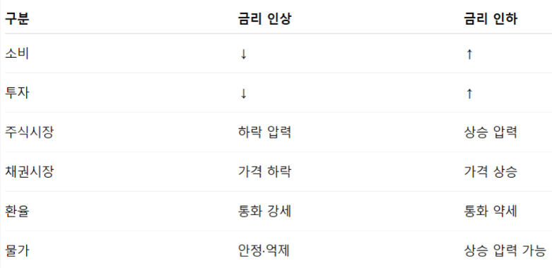 금리 인하: 경기 부양·소비 촉진 → 투자·고용 활성화